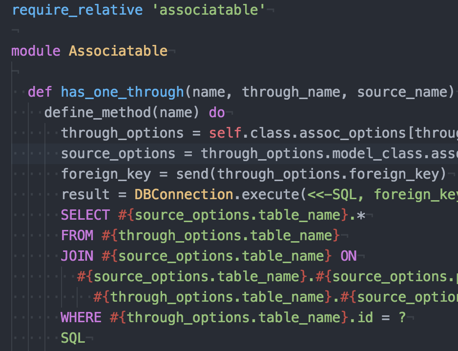 Implemented key Active Record functionality including ::all, ::find, ::where, #save, and #update. Added #has_many, #has_one_through, and #belongs_to associations.