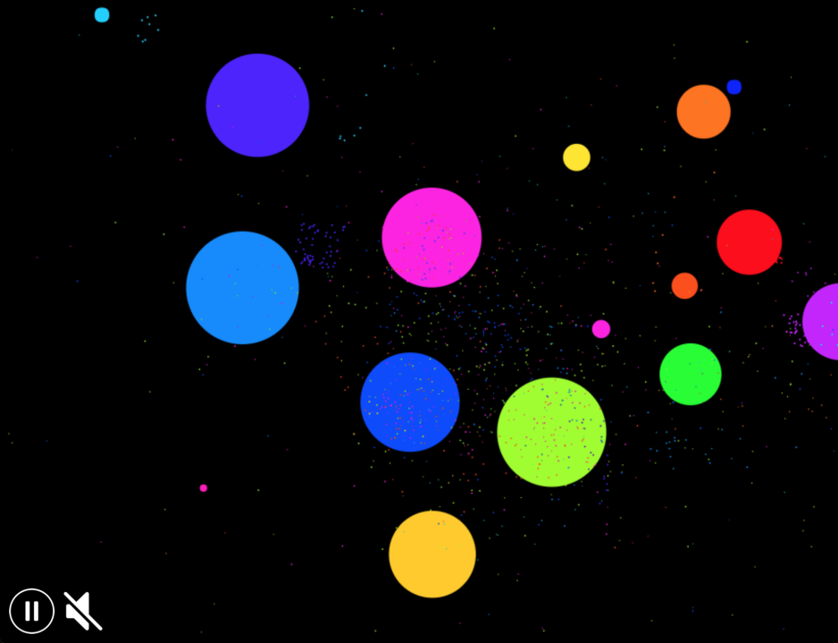 Hand rolled physics engine to manage elastic collisions and gravitational forces. Leveraged vector mathematics to manage color absorption and glitter effects.